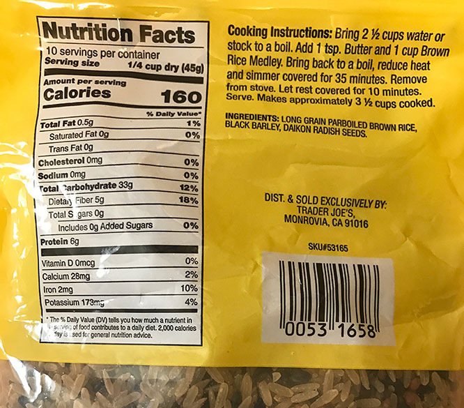 Trader Joe’s Brown Rice Medley – “A delicious blend of long grain brown rice, black barley and daikon seeds”