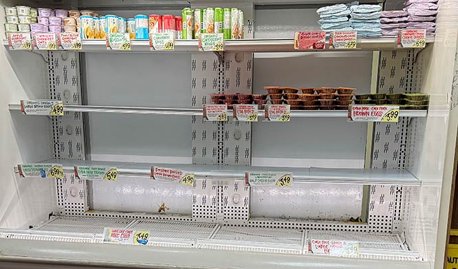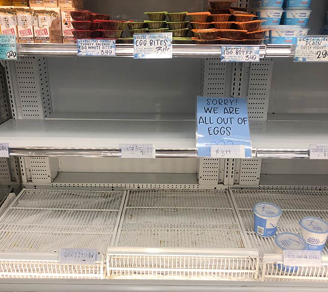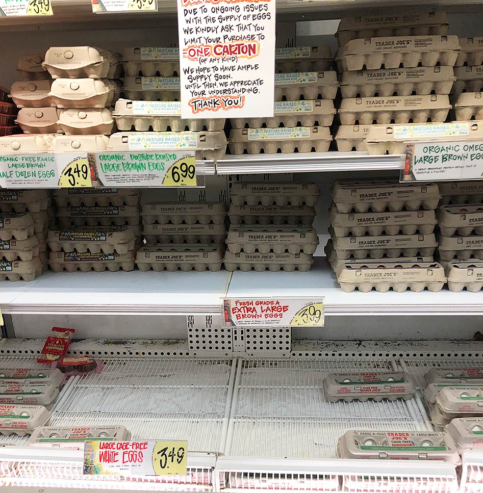 Trader Joe’s is getting a limited supply of eggs delivered to them daily. The same employee told me, “We get a delivery in the morning. We put what we have out then and they’re first come first served. So come earlier. By the afternoon, they’re usually sold out.” (Early bird gets the worm?)
