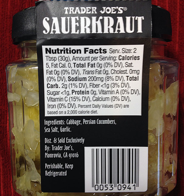 Trader Joe’s even says if you are not a fan of the stuff, this may change your mind about SAUERKRAUT. Now that’s confidence in your product, huh?! Unlike commercially made mass-produced sauerkraut which is cooked, this one is a raw,fermentedfood product which doesn’t even have vinegar. TJ’s says its made by a small batch producer in the traditional way, which is simply cabbage treated with salt and left to ferment. Old School. The real McCoy. “This is Sauerkraut like your great grandma used to make.”