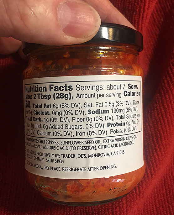 How to use Bomba ? Of course this is going to be great added to tomato sauces, say on pasta or pizza or what have you. But what about other pasta dishes? A spoonful mixed into your Spaghetti Aglio e Olio? For sure! A little bit in your Carbonara? Controversial perhaps but I do it, and it is terrific. What about all those Gnocchi you love from Trader Joe’s? Regular, cauliflower, kale, shelf stable or what have you… OMG folks, a dollop of this Bomba with garlic and good olive oil will make your gnocchi soar. Still, Bomba is more than “just for Italian” food. I put a little bit into my scrambled eggs. It’s divine with eggs of any kind. A drop of it onto of my buttered, toasted baguette is great. A little bit mixed into avocado toast or guacamole. Add a little bit of Bomba to your marinade for meat or chicken. Dips and sauces? Perfect. You can mix this up with some Greek yogurt (or mayonnaise for that matter) for an instant wonderful sauce, to top some cooked Chicken Breasts, Shrimp, or Tofu as well. Or try that mix as a dip for some chips. Drizzle some with olive oil and garlic on your roasted veggies. Add a spoon of this to your soup or most any sauce to give it some jazz. I even love it on cottage cheese on toast (no, seriously that’s really good). On my sardines on toast. I suggest adding some fresh garlic when using Bomba. Of course these two go very well together. Asian food?! OMG yes, yes, yes! Honestly the list of things and types of food Bomba can improve and go with is endless and I promise, you will discover uses on your own (please share some with us in the COMMENTS below). TJ’s Bomba is truly a premium gourmet offering. Amazingly Trader Joe’s sells this for $2.99 a jar, which is honestly incredible for such a product. Oh and it’s really Italian, it is a “Product Of Italy”. I have found it sold out on occasion as its a big hit. So if you like it, next time grab an extra jar to keep in the pantry like I do (but just one, leave some for me, and the next guy!) Ingredients are: Chilies, Sunflower Oil, Olive Oil, Basil, Salt, Ascorbic Acid, Citric Acid. Honestly even if you are not really the “hot sauce type” I suggest you get a jar of this to try. Calabrian chili’s are not super hot; they are in the “medium” spice level. People can pop them in their mouths easily. Personally I can’t live without having a jar of Bomba in the fridge now and if you try this, you may feel exactly the same.