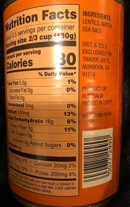 Trader Joe’s lentils cost 99 cents for a 15 oz can. The can says “Product of Australia, packed in Egypt”