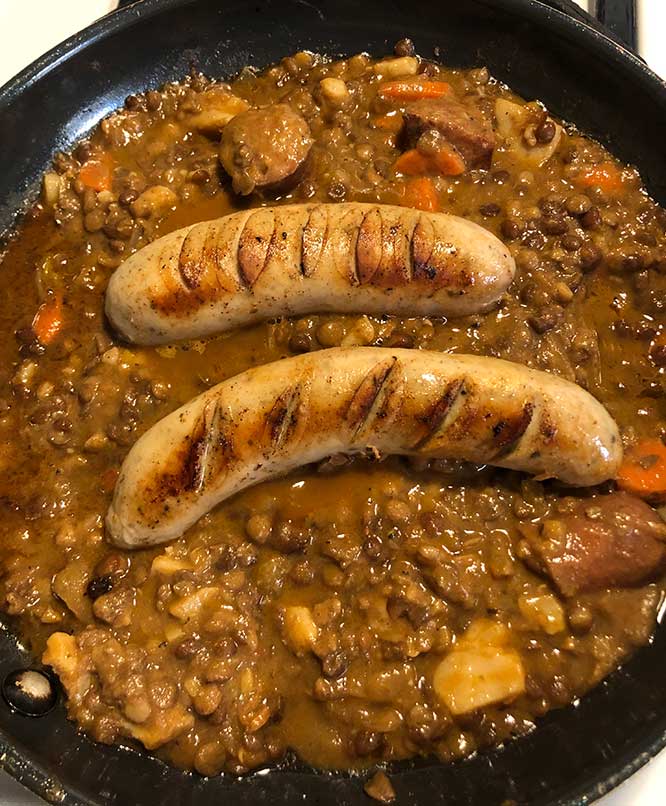 Want to make French lentil soup instead? Just add all the liquid from the can plus another can of water or stock. Add more chopped garlic. Simmer about a 1/2 hr. You can slice up the sausages, or eat them on the side.