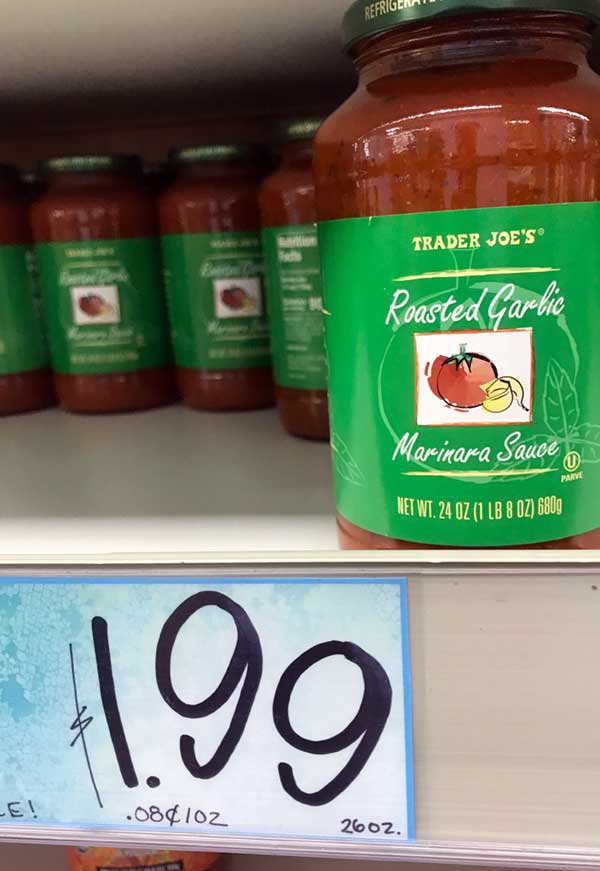 Look carefully at the sign. The sign says the jar of this (very good!) marinara sauce contains “26 ounces”. They hadn’t gotten to fixing the sign yet because you may notice the label on the jar, says “24 oz“. Clearly this marinara use to contain 2 more oz. Trader Joe’s shrunk the amount instead of a price raise?