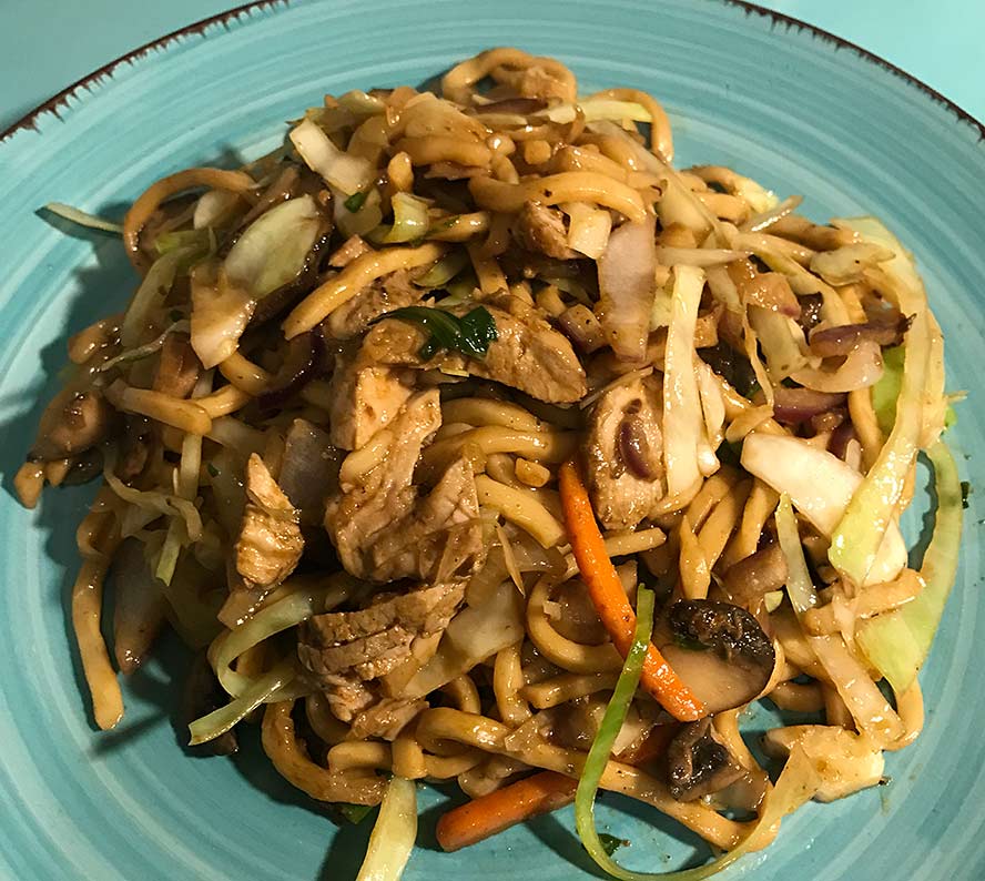 Like almost any Asian noodle, something as simple as throwing on chopped scallions, or cilantro will add a good deal of Asian flavors. Here I have added the TERIYAKI CHICKEN MEATBALLS plus yellow bell peppers in a stir fry with the noodles.
