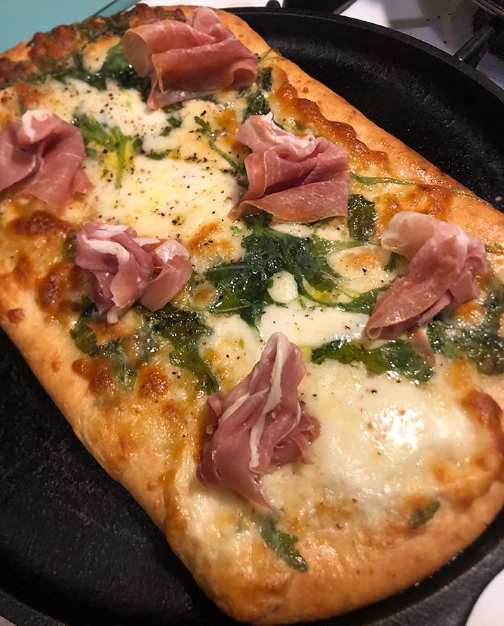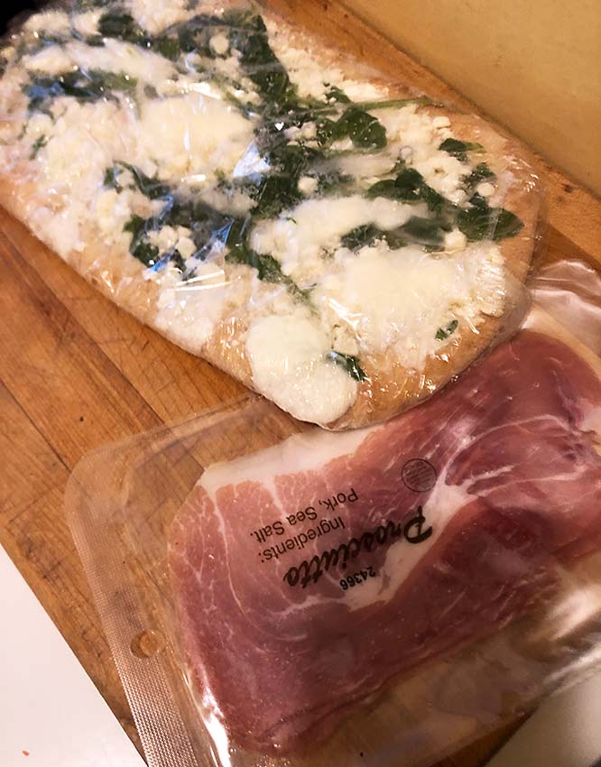 I confess I did actually try to get the bottom a bit crispier by putting it back in after I pulled it out the first time, for about another two minutes. In hindsight this was a mistake, as I over-baked it a little and doing that made the outside border crust a bit dry and hard. So try the recommended times (the box says bake 9-12 minutes at 425 F) If you have a pizza stone or steel, I would use that. If not, even a 1/2 sheet pan will do. And as always pre-heat your oven for at least 20-30 minutes, though every oven is a bit different.