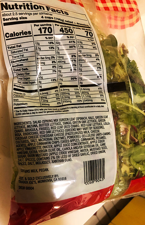 Trader Joe’s HARVEST APPLE SALAD kit, $3.99. I’d say one bag is about enough for about 2 people as part of a dinner. Or one salad lover. Again, add some sliced chicken on top of this and you could make this a nice balanced lunch or dinner.