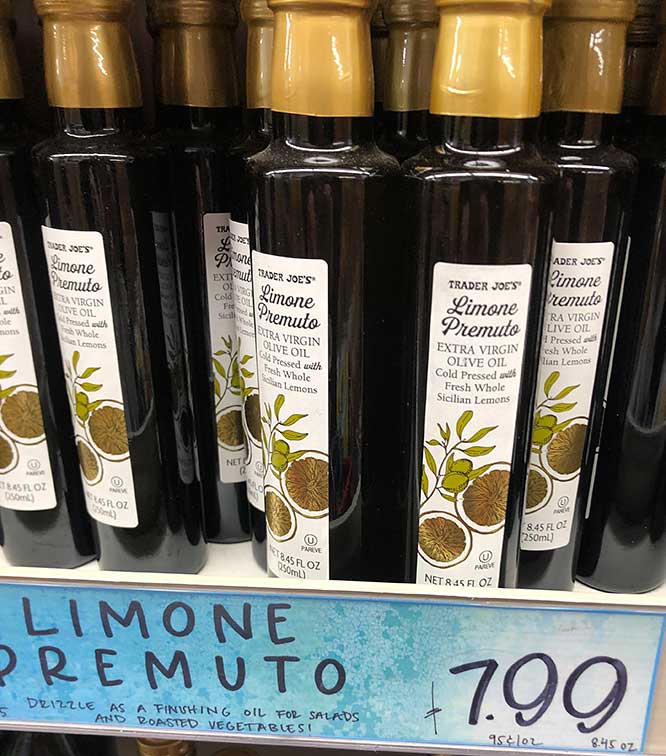 Trader Joe’s LIMONE PREMUTO costs $8 for just over 8 oz. In contrast TJ’s sells a 17 oz bottle of excellent SICILIAN EVOO for about $12 (which used to cost $10!) That Sicilian oil is double the size of this bottle. If I add a squeeze of fresh lemon and perhaps even a little lemon zest on my dish and get a similar effect, albeit my lemon is not Sicilian! Therefore though I like this oil, it’s a “specialty oil”, a little splurge. Still, you would be drizzling on just a bit of this. On a budget I would probably buy the bigger bottle of their Sicilian EVOO and add my own lemon, or garlic as desired.