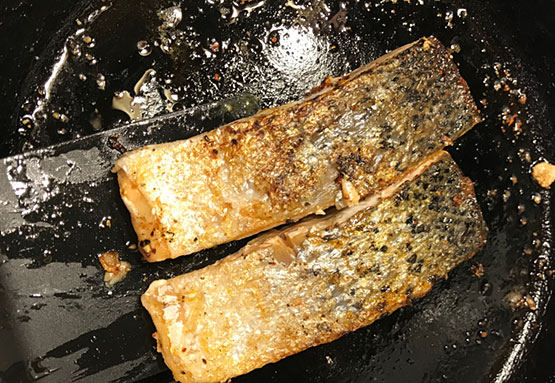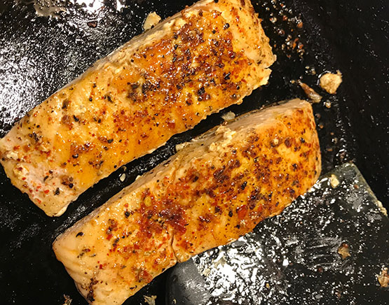 After drying off the salmon, I gave it seasoning on both sides with a nice sprinkle of AJIKA which will give great color as well as flavor (in my case as it was brined, I added no more salt). I cooked the fillets using the pan fry method in a cast iron pan (or use a non stick pan) in a mix of oil and butter for about 5 minutes on the skin side first till the skin looked crispy. Flipped them, then cooked about 2 minutes on the second side which needs less time than the first. Personally I hate overcooked fish. Cook fish just till it’s no longer translucent and flakes easily with a fork. You can always put it back for 30 seconds if it needs it. You don’t want to dry it out especially as farmed salmon has less fat.