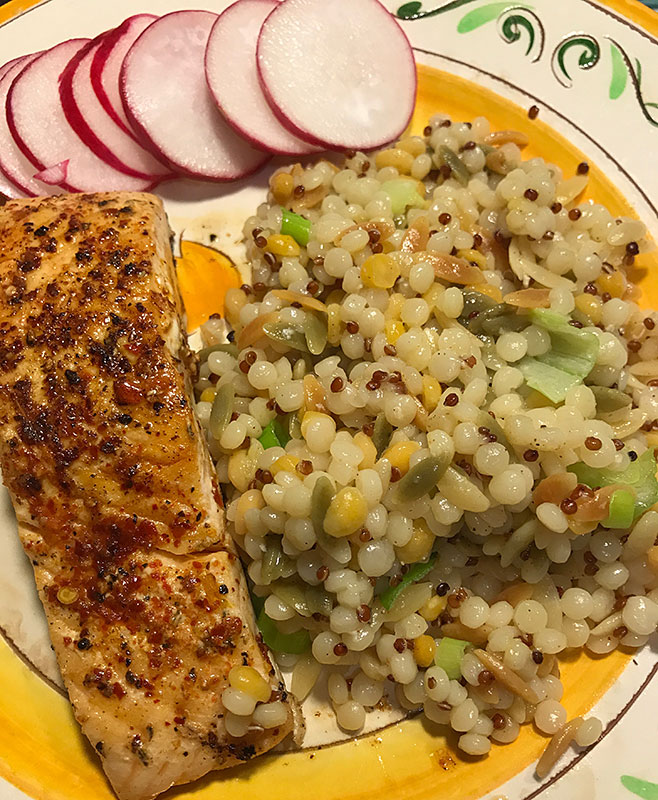 SAUCE: If you want to serve with a sauce, TJ’s tzaziki sauce will be great with salmon. Or Greek yogurt mixed with lemon juice, or tartar sauce. Even simple lemon juice and butter is great. Fresh dill is wonderful with salmon. This time I plated the salmon up with some lemon butter, and served it with a side of TJ’sHarvest Grain Blend (shown) which is perfect with this. The salmon was tasty, if a bit mild of course as this is farmed. Wild salmon, which I love is usually about double the price of this. Trader Joe’s sells this for $8.99 for a 1 lb package (a bit little over $2 a portion). For the price I think this salmon is very tasty and a good value. I find Trader Joe’s version, superior to Costco’s version. So giving this a thumb’s up for value and quality. INGREDIENTS: Atlantic Salmon (no added salt) Protein = 23 grams! EAT FISH