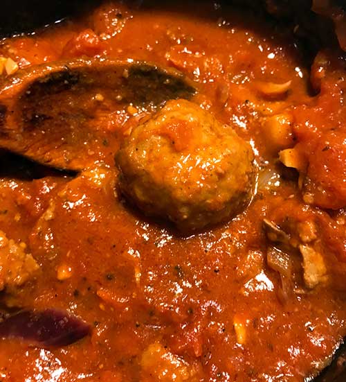 FAST EASY TOMATO SAUCE and MEATBALLS: Take 2 tablespoons of tomato paste and sauté that in a few tablespoons of olive oil for 30-60 seconds. Add a good amount of sliced garlic and a little diced onion and cook 5 minutes on low stirring occasionally till onions are translucent. Add a can (or two) of Diced Tomato, rinsing out the can with a little water (or wine) to get it all. Simmer on low 45 minutes, with the thawed and browned meatballs. Add Italian Seasoning to taste. Optionally add capers, and some Bomba. When serving, add grated Parmesan, Pecorino, Asiago or Grana and if you have some fresh basil, lovely. Serve with either pasta, gnocchi, or warm fresh Italian bread for a meatball hero.