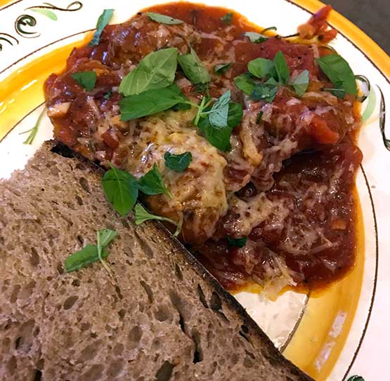 Caro Sugo just has such a fresh, natural taste from excellent probably freshly harvested tomatoes plus Italian olive oil and fresh (not dried) garlic, and whole basil leaves. It’s got bits of tomato, a few little chunks. It’s not smooth like many jarred sauces are. Meaning not over processed.