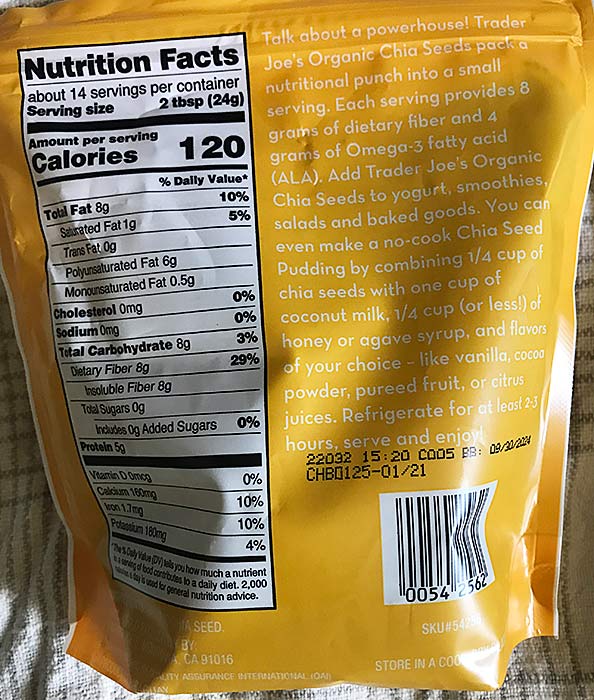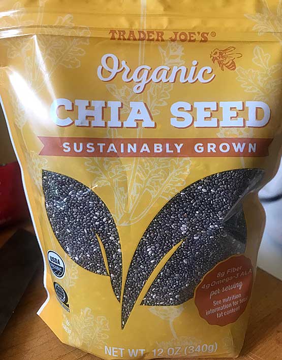 Trader Joe’s sells a number of super food seeds including chia seeds, flax seeds, a mix of chia and flax, as well as hemp seeds. All of these are good for you and are things you can easily incorporate into your diet, daily, especially I think at breakfast where you can add 1 or 2 tablespoons into your cereal, yogurt or smoothie. Try CHIA SEED PUDDING; very easy and very good! (another one in link below)