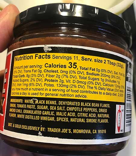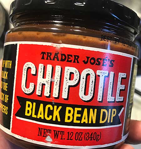 Trader Joe’s CHIPOTLE BLACK BEAN DIP is delicious. I think this could even be one of their best products. It’s one of my favorites in any case and I try to always have a jar in the panty… It’s that good. It matches especially well with tortillas, or any of TJ’s excellent chips especially corn. It matches perfectly with TJ’s Organic Corn Chip Dippers. The Chipotle Bean Dip gets a spicy back beat from two kinds of chiles, chipotle and ancho chiles, which give this a slightly spicy heat level plus a tomato-y undercurrent. This dip is terrific as-is on its own but it’s also good as an ingredient. When I make quesadillas or tacos, I sometimes spread a little of this on the tortilla before cooking them or just serve some on top or on the side when I plate them. Naturally this is way healthier dip to put out for people compared to dips which have loads of calories / fat like a sour cream or cheese based dip. You can even mix a jar of this with a half can of the refried black beans which will make a nice side dish or a less spicy but still tasty dip, depending on the ratio. If you find this dip too thick, just mix in a teaspoon or so of lime juice, vinegar or water and thin it out to your liking. A jar of the BLACK BEAN DIP is $1.99 for 12 oz.