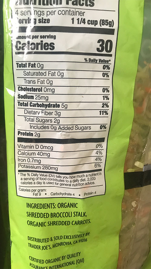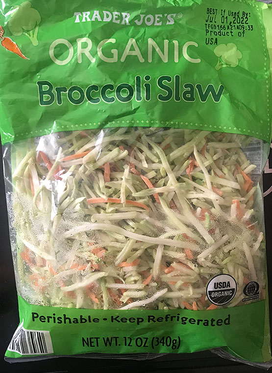 This package can make a really really good coleslaw. We really liked the slaw made with this, a variation from a regular salw made from cabbage. To make the slaw, I basically used the recipe on the package with one difference. I used way less than the “one cup” of your favorite salad dressing as they suggest. You don’t need that much; if you need more sauce just add a little vinegar and a little honey or palm sugar. Yes it does say “organic shredded broccoli stalk”. I promise you won’t even know, the finished slaw will soften up and be like any regular coleslaw after it marinates for awhile (20-30 minutes). Personally I never throw out the stalk when I make broccoli, I peel and cook it – but when I met my wife, she just chopped of the head and threw out the rest!