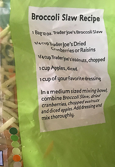 (here’s my modified recipe) COLESLAW : Dump the package in a bowl. Add one grated apple (grate on box grater with skin), add a handful of dried cranberries or golden raisins, add about an ounce or two of Organic Apple Cider Vinegar and add just enough of your favorite dressing to lightly coat things (maybe a 1/4 to 1/3 of cup? The package says 1 whole cup of dressing – come on, that’s way too much. I used TJ’s Organic Ranch Dressing. Or you can just add some mayo. A sprinkle of DILL SEASONING will be nice in this. Mix everything up and let it sit for about 20-30 minutes in the fridge to marinate. It will soften up. The slaw can easily stay in the fridge for the next day. This is a very tasty and healthy side dish!