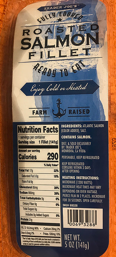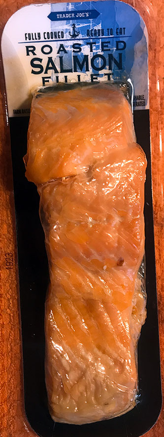 This is now one of my favorite New Products at Trader Joe’s. A fully cooked, lovely fillet of Roasted Salmon. Find it in Refrigerated near the fresh fish and smoked salmon. This cooked piece of salmon is so handy and convenient, especially for hot summer days, or anytime you don’t want to cook (or smell) fish cooking. The salmon is fully cooked but just barely, it’s incredibly moist, so you can even heat it up a wee bit if you like, which I did. Now the first time I bought this I didn’t check the dates carefully, and when I opened it, I smelled the tiniest bit of a fishy smell. A sprinkle of lemon took care of that and it tasted fine. However the second time I bought it I checked a few packages and noticed some had a date maybe a day or even two older than another package. So naturally I picked out a package with the most recent date, and when I opened it that night for dinner the salmon had no smell at all. So check the packages carefully and get the latest dated ones.
