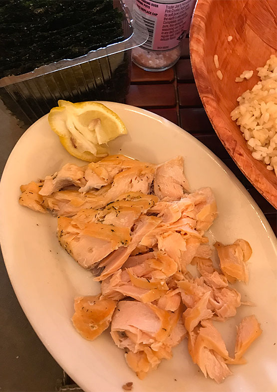 I made some Sushi Rice and served up these tasty little bites of Salmon Hand Rolls (“Temaki Sushi”) with the salmon and matchsticks of cucumbers on TJ’s SEAWEED SNACKS (nori). One piece of salmon was enough for two of us with the rice and other things. We REALLY enjoyed these sushi bites. You take a square of nori in one hand, gently spoon on a little sushi rice add some salmon and cukes, then pop the whole bite into your mouth. This is super tasty. Really, try making this, it’s fun and delicious.