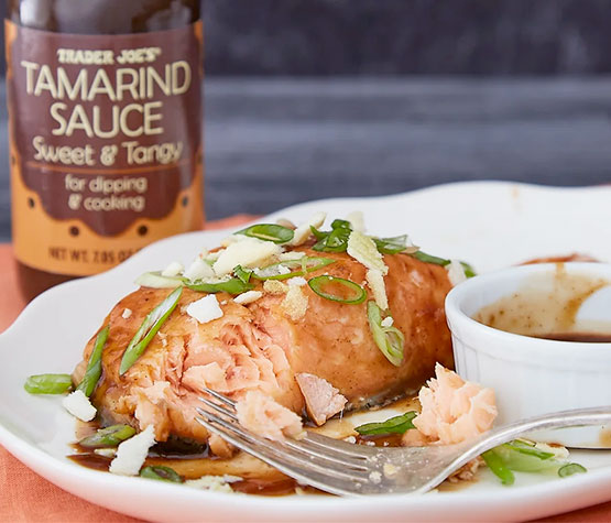 60 Second Tamarind Salmon Sweet and tangy with a gentle heat, Trader Joe’s Tamarind Sauce delivers maximum flavor with no prep time required. Slather it on a Trader Joe’s Fully Cooked Salmon Fillet and serve atop a bed of rice or salad greens for a protein-packed, positively satisfying meal that’s ready in about a minute. For a pleasant crunch, top with Trader Joe’s Crispy Onion Chips and fresh green onions.