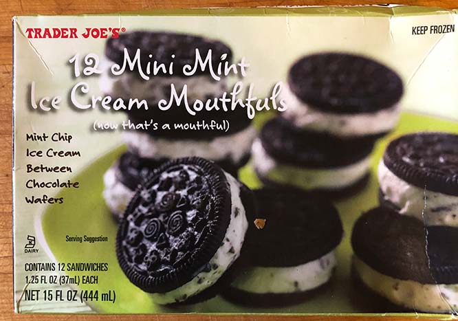 Basically these are small ice cream sandwiches; with mint chocolate chip ice cream between two chocolate wafers, like an Oreo/Joe Joe’s but these wafers are pretty soft.