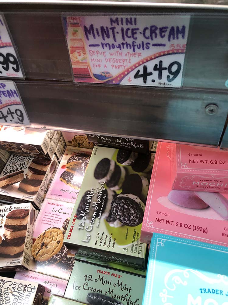 “Our supplier infuses an ice-cream base of milk, cream, and cane sugar with a paste made from roasted, finely-ground Black Sesame seeds. This paste not only lends a rich gray-black hue, but also brings that characteristic nuttiness with a hint of savory to contrast with the flavor of the frozen sweet-cream. Surrounded by a rice-dough wrapper which has also been given the Black Sesame- seed treatment, the resulting couple-bite-sized frozen treat is intriguingly tasty, and an instant conversation starter during your dinner-party dessert course.” – Trader Joe’s