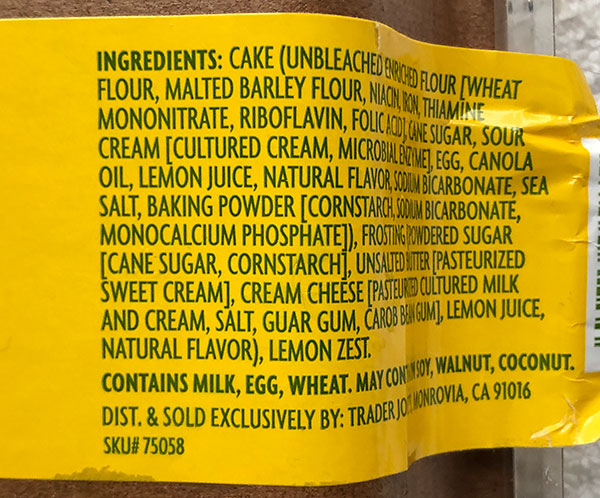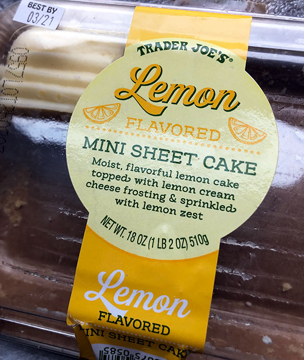 This cake has come back to Trader Joe’s shelves. This lemony sheet cake is yet another addition to their very popular line of of “mini sheet cakes”. This lemon one is in addition to the chocolate and Chantilly creme versions, plus a gluten free cake as well.