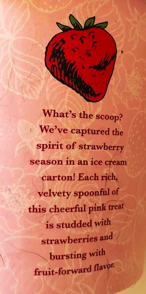 “What’s the scoop? We’ve captured the spirit of strawberry season in an ice cream carton. Each rich, velvety spoonful of this cheerful pink treat is studded with strawberries and bursting with fruit forward flavor”