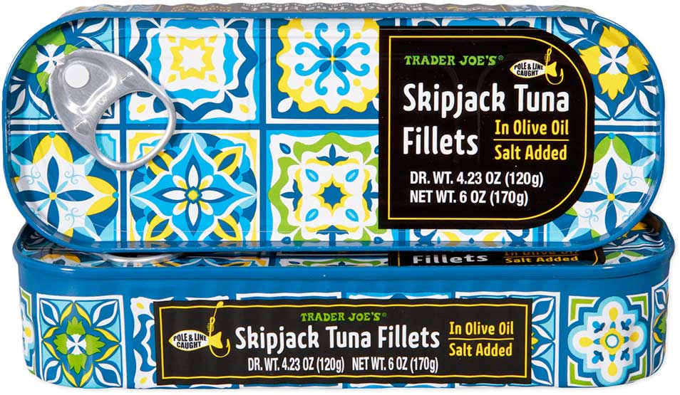 Trader Joe’s says: ‘”Has there ever been a better time to be a tinned fish enthusiast? It seems like all sorts of prepossessing piscine proteins are popping up on shelves, and we here at Trader Joe’s are proud to do our part with options like Trader Joe’s Skipjack Tuna Fillets in Olive Oil. They’re made for us by a supplier in Tunisia, who sources their Skipjack Tuna in the Mediterranean, which is caught via sustainable pole-and-line fishing methods to reduce by-catch. The loin of the Tuna is cut into long, flat fillets, then lightly salted and cooked to perfection, then packed in Olive Oil so that they’re ready to be used in all sorts of culinary contexts right out of the tin.”