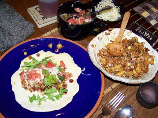 Now of course if you don’t feel like doing all the “work” you could accomplish something close by picking up at TJ’s, tortillas (flour or corn, the Chili Lime ones would be good!) and salsa, and use the soy chorizo on its own (or with thier frozen corn?) and whip a similar dinner together in no time.