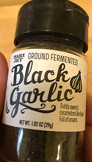 This is a pretty interesting Trader Joe’s product, a bit of an unusual find. Now a few years ago, they sold something in the produce section labeled “Black Garlic”. It was from Japan. It basically looked like a whole head of garlic you had forgotten about in the pantry that had shriveled up and turned completely black! Wild looking! I tried it. Inside shriveled shells were cloves of black garlic inside were softish and absolutely delicious, chock full of UMAMI. I found it to be a kind of amazing, and pretty unusual product for Trader Joe’s to carry. This stuff eventually vanished or was discontinued, anyway I stopped seeing it. Now a year or two later, I noticeed this small jar in the spices section. “Ground Fermented Black Garlic…Made In South Africa”. The black garlic has been dried and ground up into little tiny black bits that can be sprinkled onto things. It tastes garlicky but different from fresh garlic or garlic powder for one thing this was fermented. It’s full of Umami, adding extra depth of flavor to whatever you put it on. I did think it’s a little on the pricey side at $2.99 for a tiny 1 oz jar but I have found it does last a bit. It’s terrific added to sauces and as they mention vegetables. I am trying this on so many things. Avocado anything especially. I am thinking this is a hidden gem that many will look at and bypass and it may vanish in the future. So as we don’t know how long this product will last, if this sounds interesting, grab one to try.