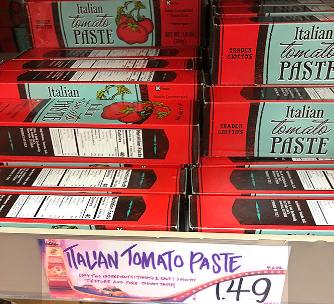 For some time I mourned the loss at Trader Joe’s of their handy Italian TOMATO PASTE in a tube which they “discontinued” maybe a year or two back. At the time I asked the TJ’s Captain to look it up and he said it was not even on order and that he was pretty sure it was gone for good. Fortunately it magically appeared back on the shelves recently at my Trader Joe’s and for that I say, HOORAY! So did Trader Joe’s change their minds? Did they lose a supplier and could not find one for years? Who knows? In any case I’m just glad to see this as this is a product I used to buy all the time.