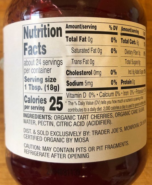 “It’s made for us with a simple recipe of tart and tangy Organic Turkish Sour Cherries, organic sugar, pectin, and citric acid, so that every jar is a genuine jubilee of pure, sweet and sour cherry flavor….” – Trader Joe’s