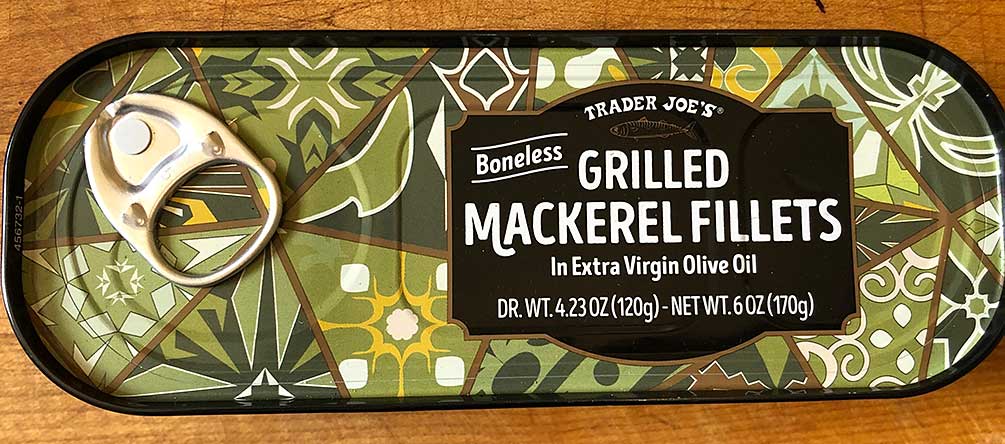 Trader Joe’s Boneless Grilled Mackerel Fillets in Extra Virgin Olive Oil are wild-caught in the Mediterranean. The fish are filleted into big meaty long pieces and Grilled and even get a few grill marks you can see in the picture. These are canned for TJ’s in Tunisia. They have a nice, meaty texture and delicate flavor profile. They’re packed in Extra Virgin Olive Oil, so I assume the oil is Tunisian.