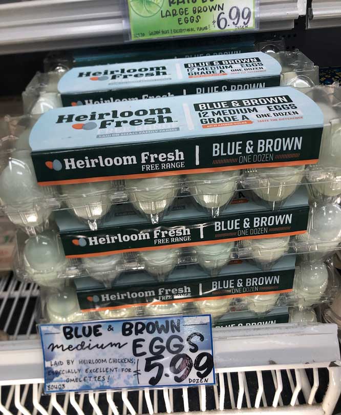 Trader Joe’s Free Range Heirloom Fresh Blue and Brown eggs (medium) $5.99/dozen