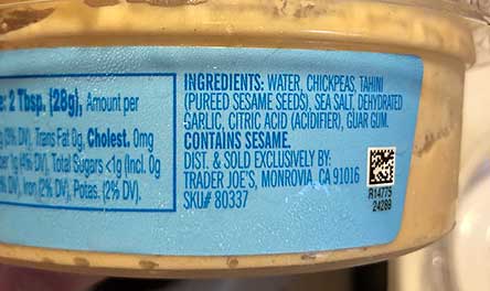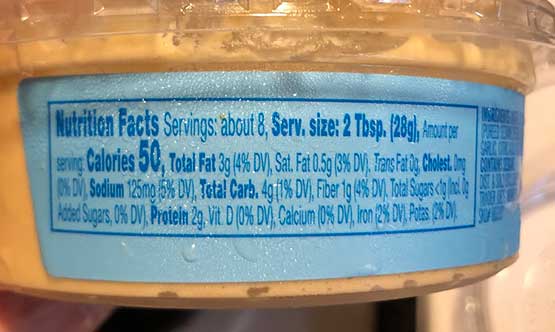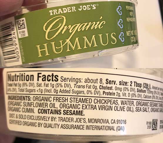 This is the reverse of (for example) the Organic Hummus which I liked (label below). As you can see in that version, chickpeas are the first ingredient. I mean, of course, right? Pretty sure any recipe witll list chickpeas as the main ingredients. The Organic Hummus list first “Fresh steamed chickpeas” with water, which is needed to smooth out the chickpeas, as the second ingredient.