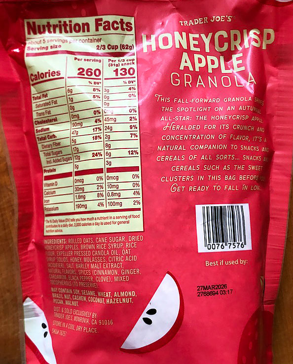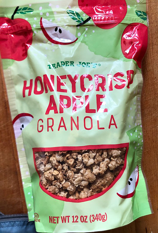 “Our latest fall-forward, seasonal cereal shines the spotlight on an autumnal all-star: the heavenly Honeycrisp apple! Heralded for its crunch and concentration of flavor, it’s a natural companion to snacks and cereals of all sorts—snacks and cereals such as the sweet, seasonally-spiced clusters inside each bag of Trader Joe’s Honeycrisp Apple Granola!” – TJ’s