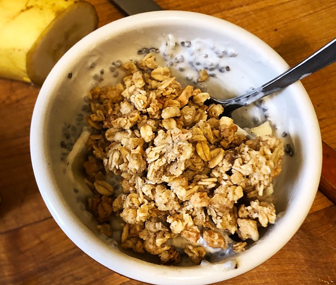 Does it taste really like apples? Yes actually it does, thanks to little bits of dried honeycrisp apples all throughout the granola. This granola not the clumpy kind; it is loose like cereal, not with the large clumps as some other granola’s that Trader Joe’s has such as the almond butter granola. Personally I am a fan of big “clumpy” granola with chunks that I can take out and sometimes just snack on. However I liked this too as it’s got that great apple fruity taste. I mean the taste of this granola is really a winner from those apple bits.
