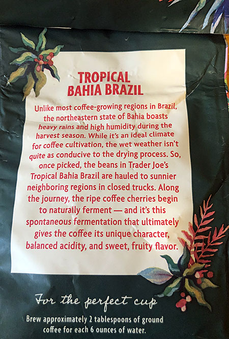 One of our readers, commented that, “it’s divine” and I agree. This small lot coffee is right up there with the very best of all those Trader Joe’s has come out with. Sure, I think they had a few clunkers here and there, but the coffee finders at Trader Joe’s who travel the world looking for good coffee made by small producers, have from time to time, brought back some really excellent finds over the years to us coffee lovers, and this is one of them.