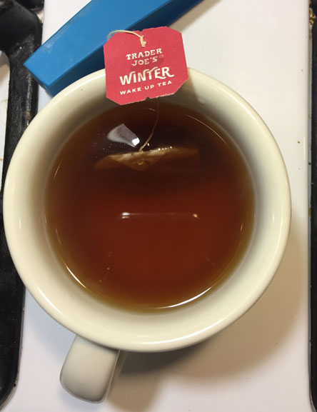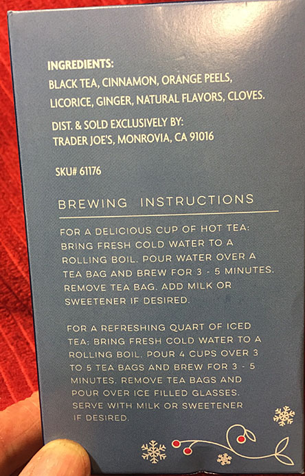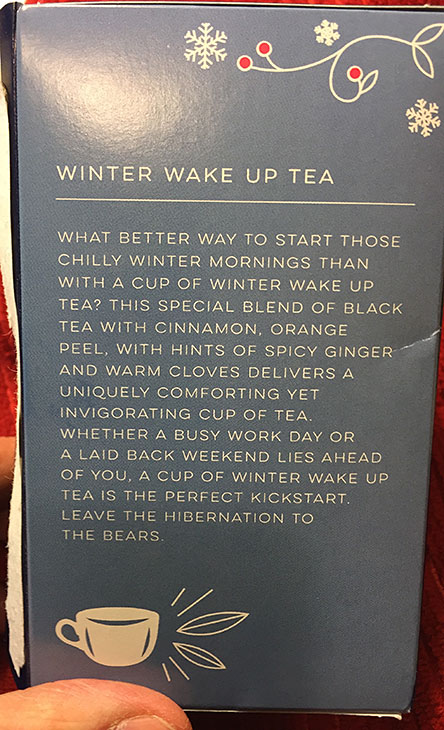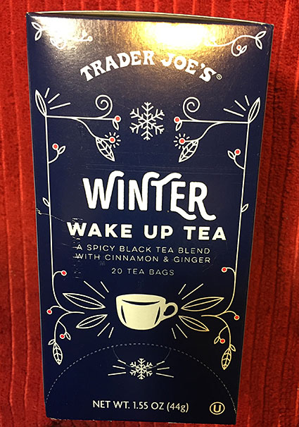 TJ’s Winter Wake Up Tea is a wonderfully balanced tasty spiced tea, a blend of black tea, cinnamon, orange peel, ginger and cloves. If it was called something a bit different without “wake up” in the name, I would have simply started the review with “A most wonderful spiced tea that will make you feel warm and toasty on a cold snowy winter’s eve, and will warm your heart and soul! Drink it in front of the fireplace and just relax….” Personally Mr. Joe, I would have named it something like, say… WINTER COZY TEA. or WINTER SPICE BLEND TEA* or something like that.