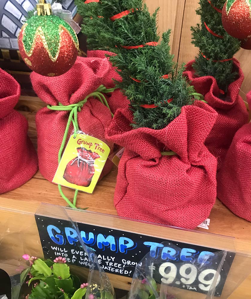 TJ’s has these little Grump trees for sale again right now for Xmas. They are cute and a pretty good deal for just $9.99. These can make a funny gift…. But wait, why”Grump” Tree? I’m guessing it’s for copyright reasons. TJ’s doesn’t want to say Grinch less they get sued by the Dr. Seuss estate. However they can get away with saying Grump and we all get the reference to The Grinch by it’s design (a clever idea just wrapping the tree to a point). If you don’t feel like laying out a ton of money for a Christmas tree ($50-150?) maybe you could get away with a little Grump tree and dress it up really nice with a lot of decorations… And it will last. If you take care of it, it will grow and grow and maybe you can use it for a few years. “Will eventually grow into a large tree. Keep well watered.”