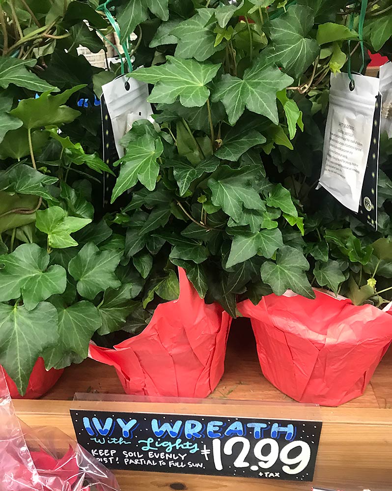 I think there’s something about buying a living plant against cut flowers or trees that won’t last. So instead of buying a wreath to hang on the door, which will just last a few weeks, this live ivy plant trained into a wreath shape will keep going all year round, as long as you water it. So while you can’t hang it on your door of course you could put this wreath shaped plant in a window with it’s blinking lights, or perhaps on a table as the centerpiece for a holiday decoration. The ones I saw at TJ’s the other day looked very healthy to me. Ivy can last forever if you take care of it. Could even be a Gift? Come with a little bag which has a short sting with about a dozen small white LED lights (takes 3 AA batteries). You can save this LED light string and use it over and over again, like I have. $12.99